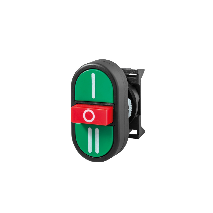 Popis: Dvojité tlačidlo má 3 pozície nepodsvietiteľné (zelená I, červená vystúpená O, zelená II). Tlačidlo je určené do otvoru 22mm. Stupeň ochrany IP40. Rad Pegasus.