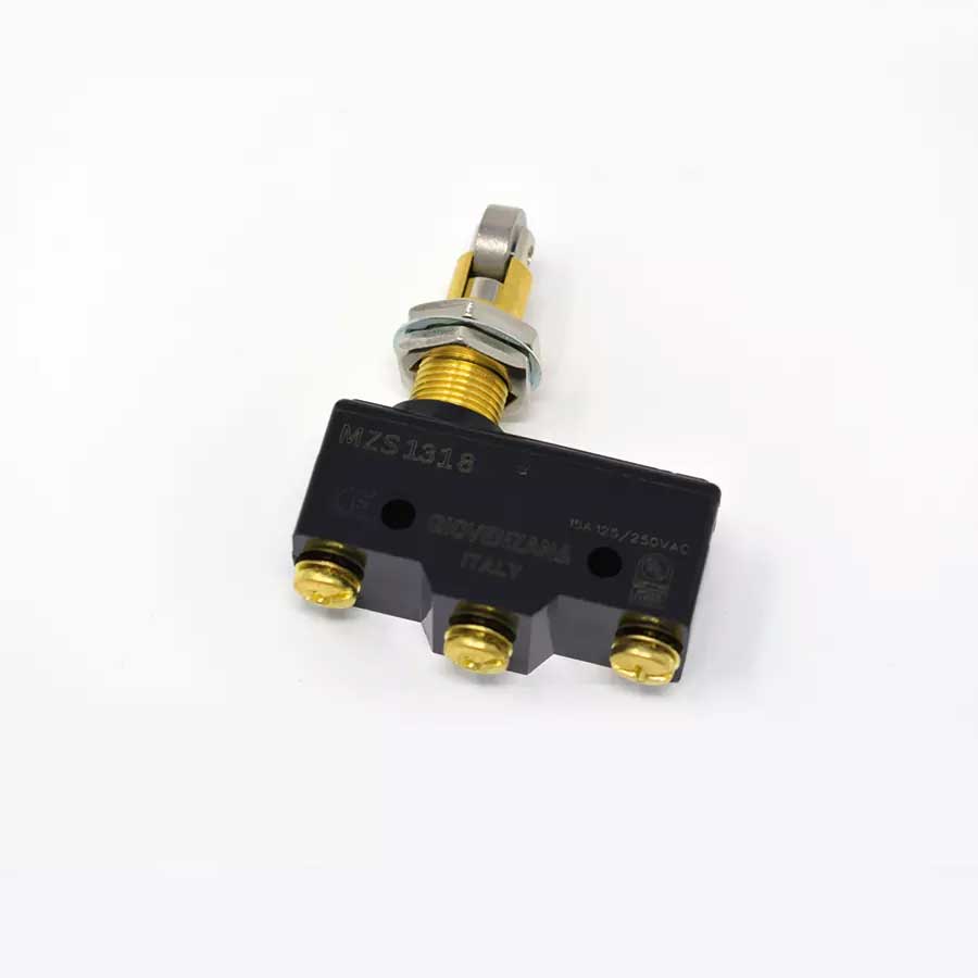 Popis: Mikrospínač MZS pre montáž do panelu so závitom s rolnou s piestom otočeným o 90°, Typ spínania: 1NO1NC okamihové spínanie, skrutkové svorky M4 x 5,5mm
