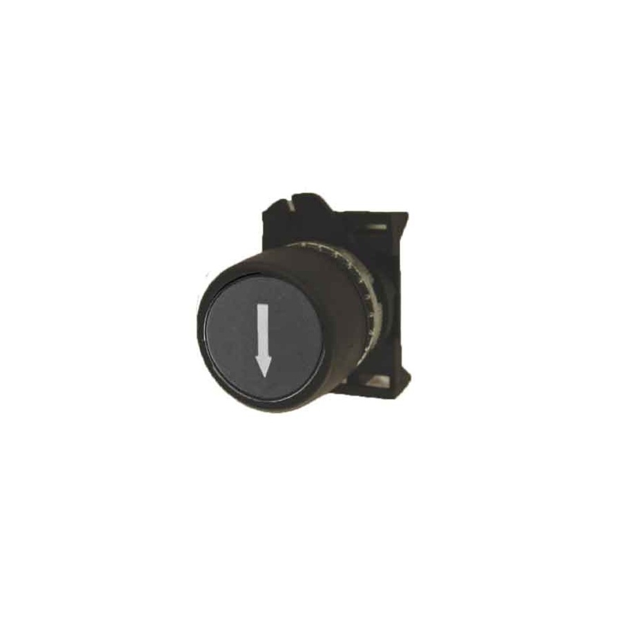 Popis: Ploché tlačidlo čierne so symbolom šípka dole, priemer hlavy 30mm, určený do otvoru 22mm, stupeň krytia IP65. Rad Pegasus.