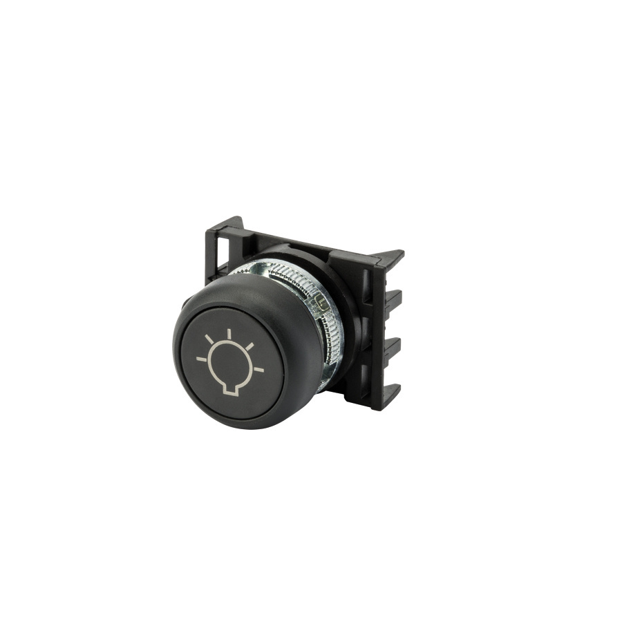 Popis: Ploché tlačidlo čierne so symbolom žiarovky, priemer hlavy 30mm, určený do otvoru 22mm, stupeň krytia IP65. Rad Orion.