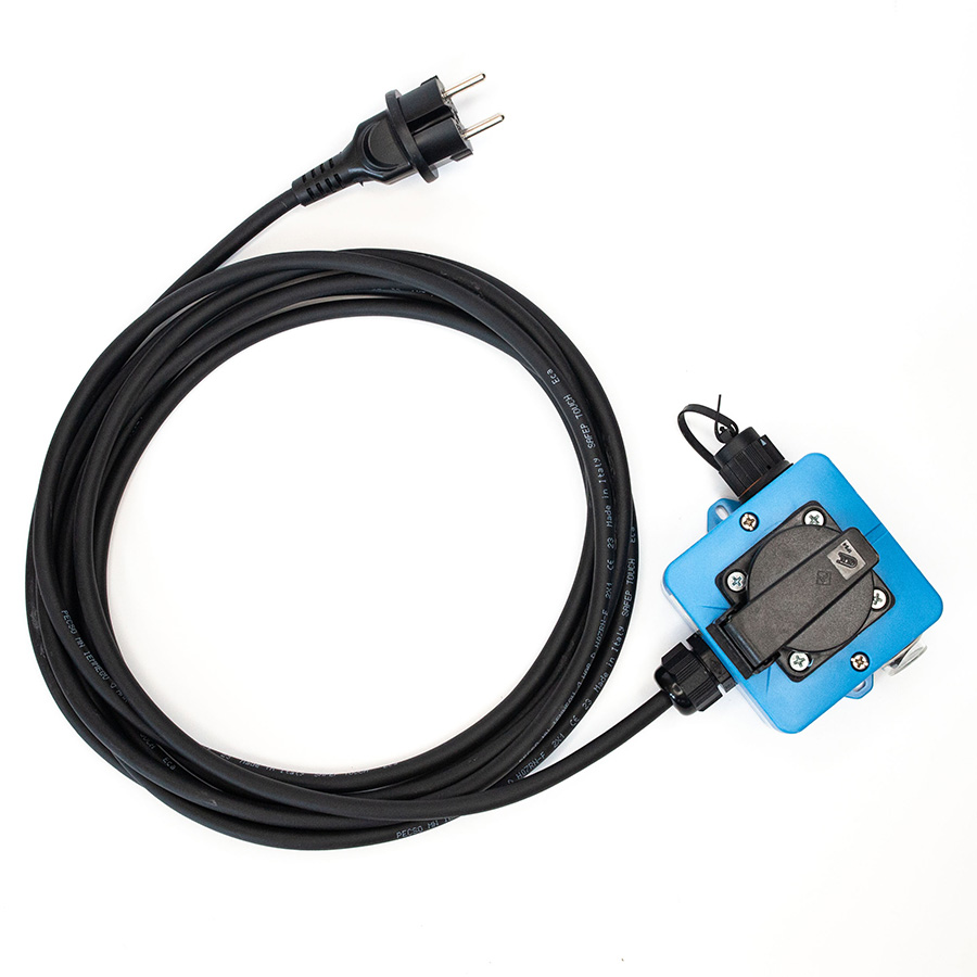 FLEXBlue pripojovací set s 1x konektorovou zásuvkou pre pohybový senzor, tvarová zástrčka na pripojenie do siete, napájanie 230VAC, 1x sieťová zásuvka na pripojenie osvetľovacieho systému FlexBlue, s prepínačom pre stále aktiváciu svietenia.