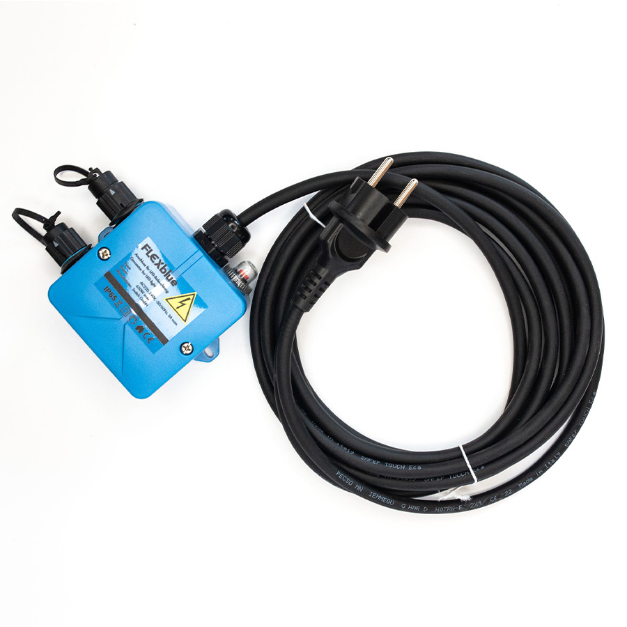 Pripojovací diel na napájanie stavebného osvetľovacieho systému FlexBlue, tvarová zástrčka na pripojenie do siete, napájanie 230VAC, 2x zásuvka na pripojenie osvetľovacích pásov, predlžovacích káblov a ďalšieho príslušenstva.