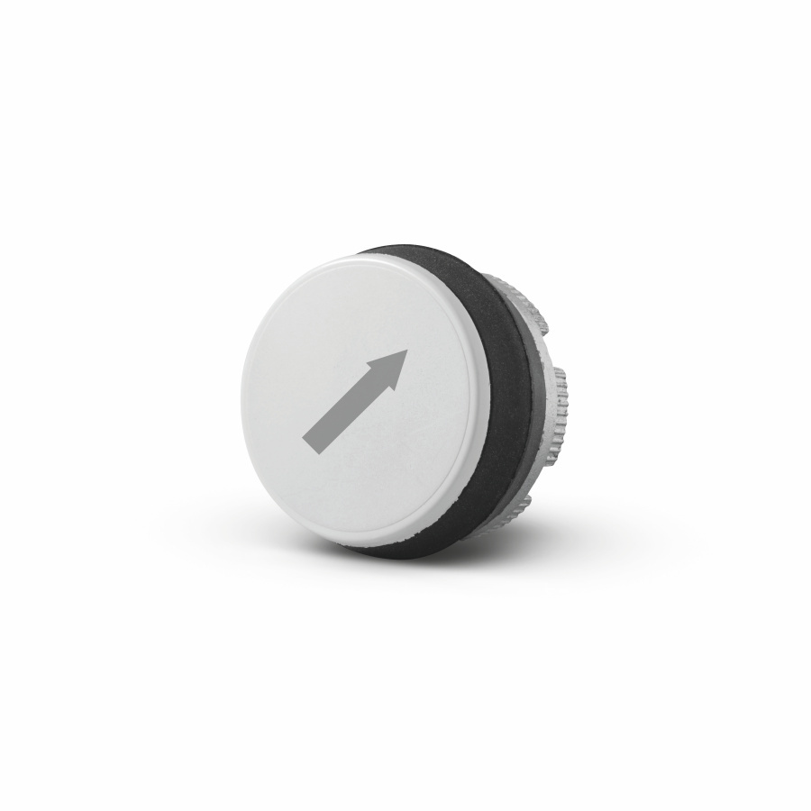 Popis: Tlačidlo závesného ovládača VPRED, pojazd mosta, jednorýchlostný, šedý znak na bielom podklade. S ochranou proti pootočeniu.
