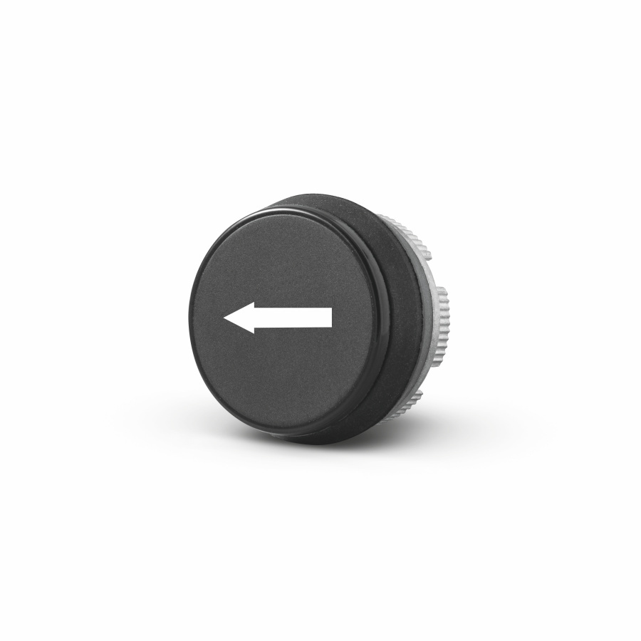 Popis: Tlačidlo závesného ovládača VĽAVO, pojazd mačky, jednorýchlostné, biely znak na čiernom podklade.
