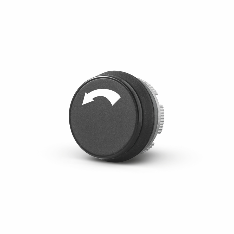 Popis: Tlačidlo závesného ovládača so šípkou OTÁČANIE VĽAVO dvojrýchlostné, biely znak na čiernom podklade.