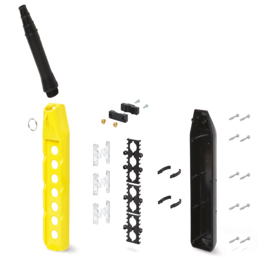 Ku korpusu ovládacieho panelu je dodávané všetko príslušenstvo na vlastné zostavenie ovládača, tesniaca guma, škúbky, držiaky káblov, blokácia, držiak na zavesenie ovládača a ďalej. viď. obrázok. Je nutné dodržať postup podľa návodu na montáž, ktorý je priložený k výrobku. Na zostavenie ovládača a primontovanie skrutiek je potrebné si objednať montážny kľúč kód: G_PCF, ktorý nájdete v súvisiacich produktoch a tiež vybrané typy tlačidiel.