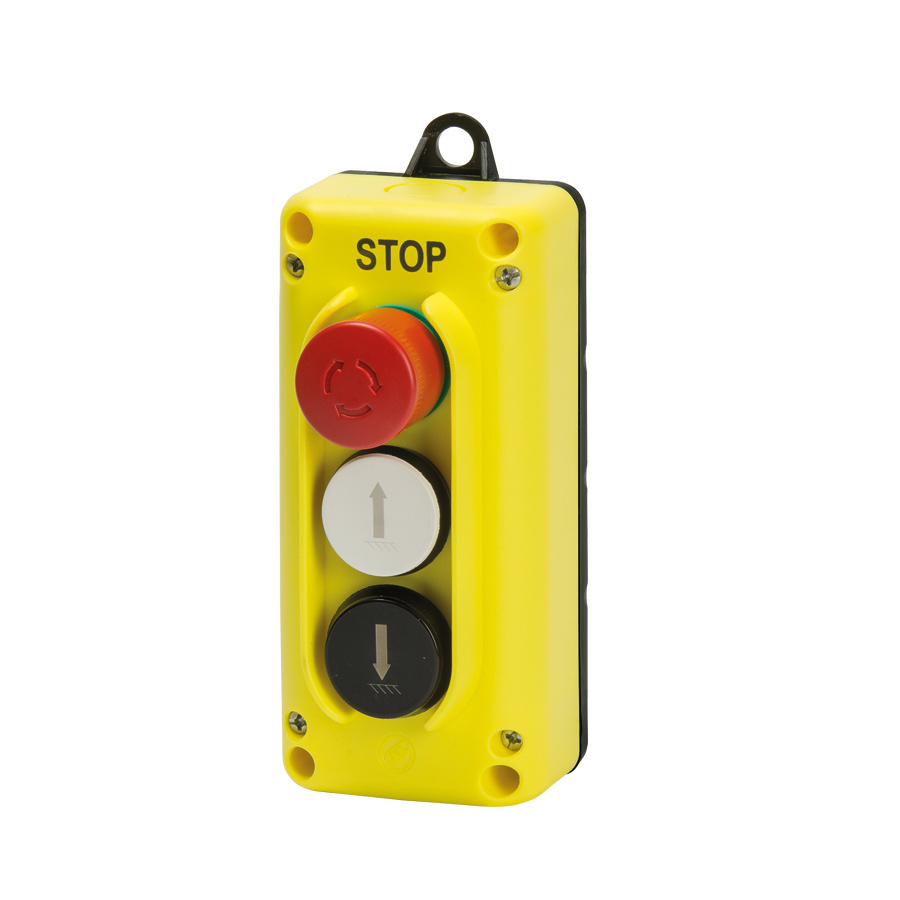 Popis: Jednoradový a jednorýchlostný nástenný ovládač s 3 tlačidlami pre zadnú zdvíhaciu plošinu nákladného automobilu.
