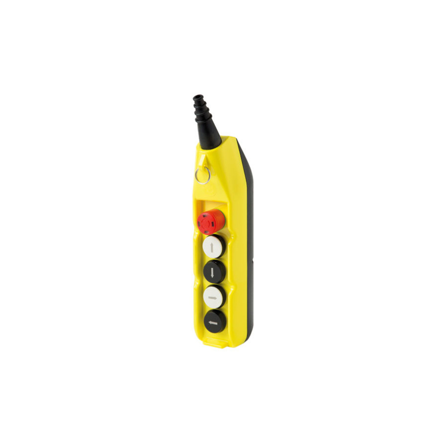 Popis: Jednoradový závesný ovládač s piatimi pozíciami. Stop tlačidlo a štyri jednorýchlostné tlačidlá hore a dole, doľava, doprava.