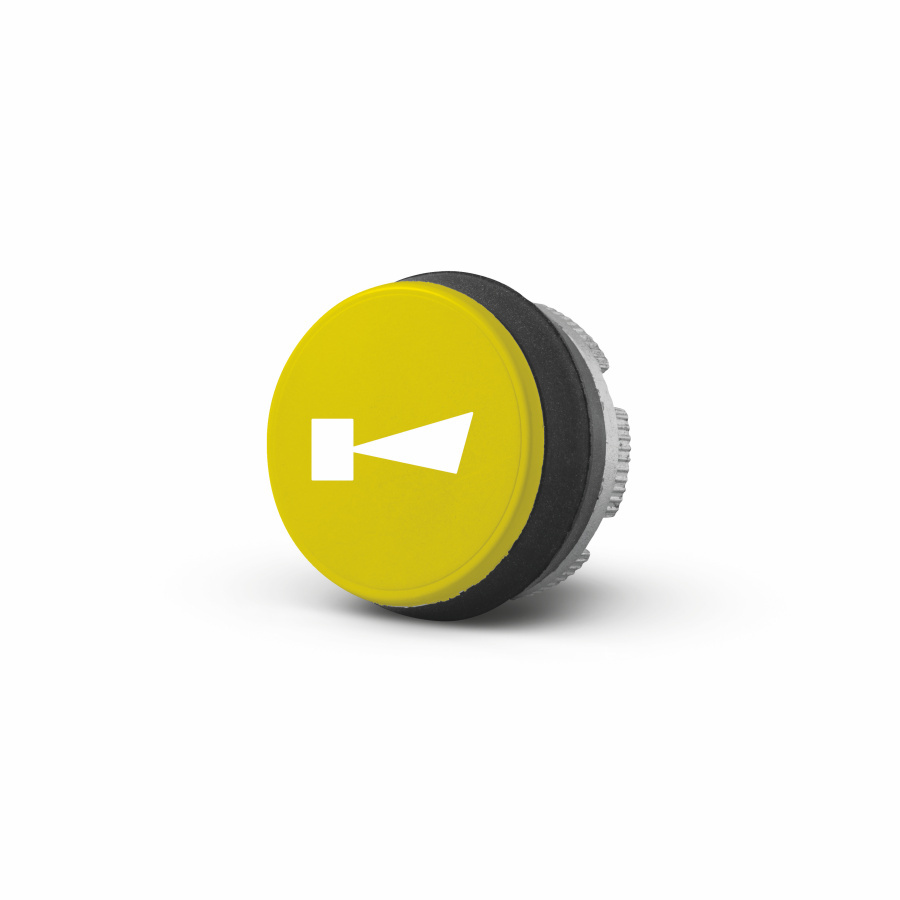 Popis: Tlačidlo závesného ovládača húkačka, biely znak húkačky na žltom podklade.