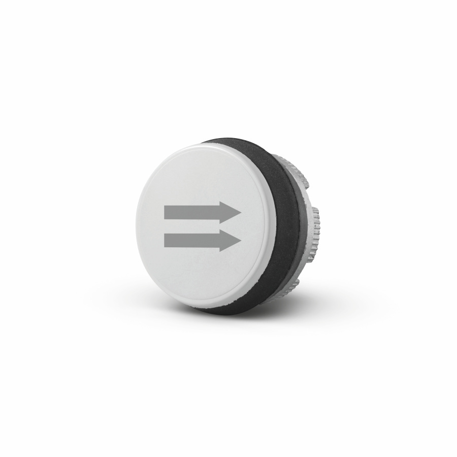 Popis: Tlačidlo závesného ovládača VPRAVO RÝCHLO, pojazd mačky, jednorýchlostný, šedý znak na bielom podklade. S ochranou proti pootočeniu.
