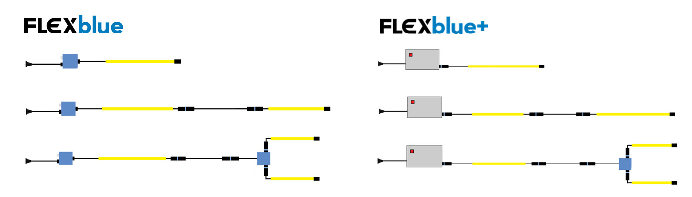 Riadiaci systém núdzového osvetlenia FlexBlue Plus v prípade výpadku prúdu aktivuje druhý svetelný okruh, ktorý rozsvieti iba každý piaty LED segment. Vďaka tomu LED pás poskytuje súčasne dostatok svetelného výkonu pri nízkej spotrebe. Núdzové svietenie teda vydrží svietiť až 2 hodiny (v závislosti na kapacite batérie a celkovej dĺžke osvetlenia).